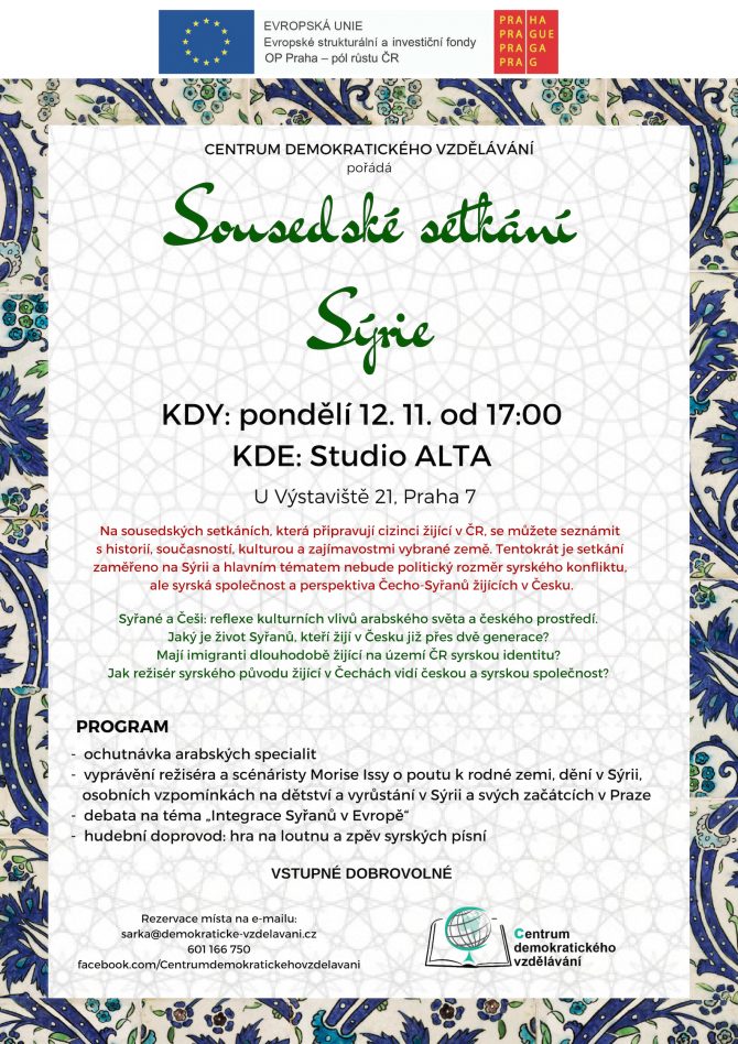 Zajímá vás, jaký je česko-syrský život a chcete si poslechnout zpěv syrských písní a hru na loutnu? Centrum demokratického vzdělávání pořádá v pondělí 12. 11. v 17 hodin v holešovickém Studiu Alta setkání zaměřené na Sýrii, syrskou kulturu a společnost.