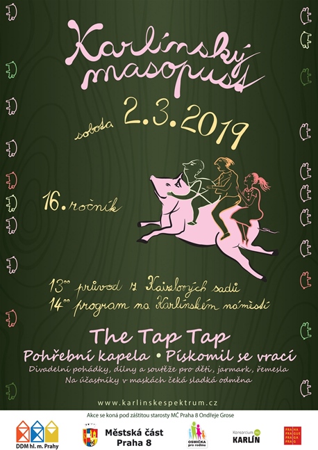 Karlínské náměstí v sobotu 2. března 2019 ožije již po šestnácté masopustním veselím. Karlínský masopust tradičně začíná v 13 hodin v Kaizlových sadech, odkud se po krátkém programu vydá průvod masek právě na Karlínské náměstí. Od 14 do 19 hodin zde proběhne nadupaný pódiový program, je přichystán nespočet aktivit pro děti i dospělé a samozřejmě nebudou chybět masopustní speciality.