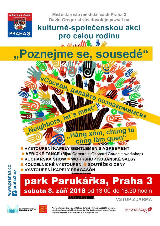 Městská část Praha 3 Vás zve na kulturně společenskou akci s názvem „Poznejme se, sousedé“. Akce se uskuteční v sobotu dne 8. září 2018 od 13:00 do 18:30 na Praze 3 v parku Parukářka. Vstup na akci je zcela zdarma.