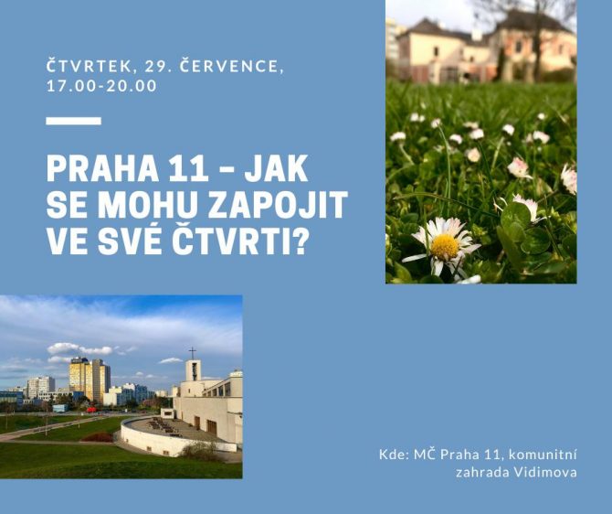 Ve spolupráci s MČ Praha 11 Vás zveme na workshop a besedu o možnostech zapojení do veřejného dění v této městské části. Během workshopu se společně podíváme na různé organizace a iniciativy, které zde existují, různé komunitní aktivity a možnosti dobrovolnictví. Představíme Vám novou příručku, která se tomuto tématu věnuje, a navštívíme komunitní zahradu Vidimova vyloženě vybízející k pořádání komunitních akcí. Tímto Vás zveme na neformální posezení, kde se můžete seznámit s dalšími aktivními lidmi v okolí a užít si rytmy latinskoamerické hudby.