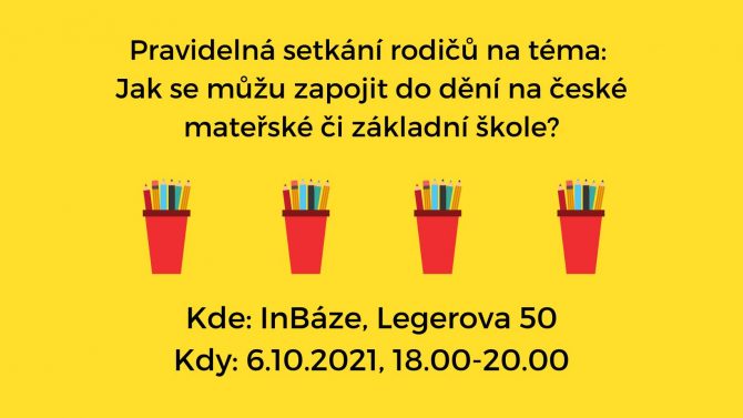 Chcete se více zapojit do dění na Vaší škole a nevíte jak začít? Zajímá Vás, jak funguje český školní systém? Chcete vědět jaké jsou možnosti podpory dětí při vzdělávání? Nenechte si ujít setkání na téma: Jak se můžu zapojit do dění na české mateřské či základní škole?