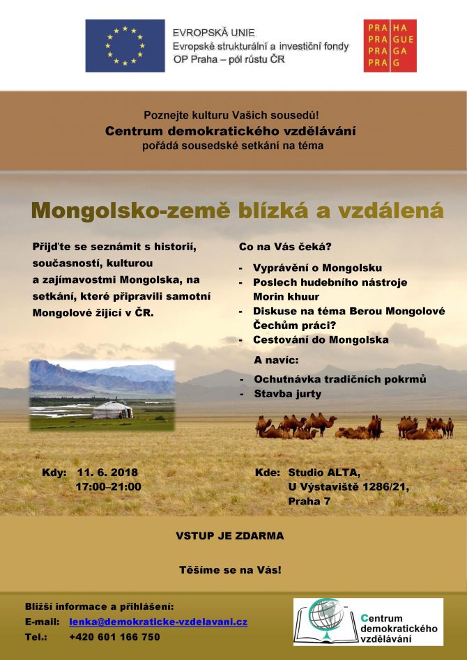 Centrum demokratického vzdělávání si vás dovoluje pozvat na další sousedské setkání, tentokrát s tématem Mongolska. Akce se koná dne 11. června 2018 od 17 do 21 hodin ve Studiu ALTA v Praze 7. Čeká vás povídání o Mongolsku, poslech tradičního hudebního nástroje Morin khuur, diskuze na téma Berou Mongolové Čechům práci?, ochutnávka tradičního pokrmu, cestování do Mongolska a stavba jurty.