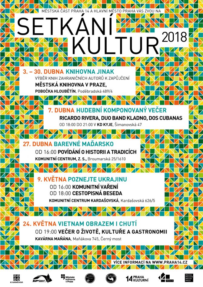 Praha 14 zve všechny zájemce na již devátý ročník festivalu Setkání kultur. Během dubna a května se lidé budou moci pobavit za tónů romské a latinskoamerické hudby, využít nadstandardní možnosti výpůjček knih zahraničních autorů v hloubětínské pobočce (Poděbradská 489/4) Městské knihovny v Praze nebo navštívit cestopisné besedy na různá témata.