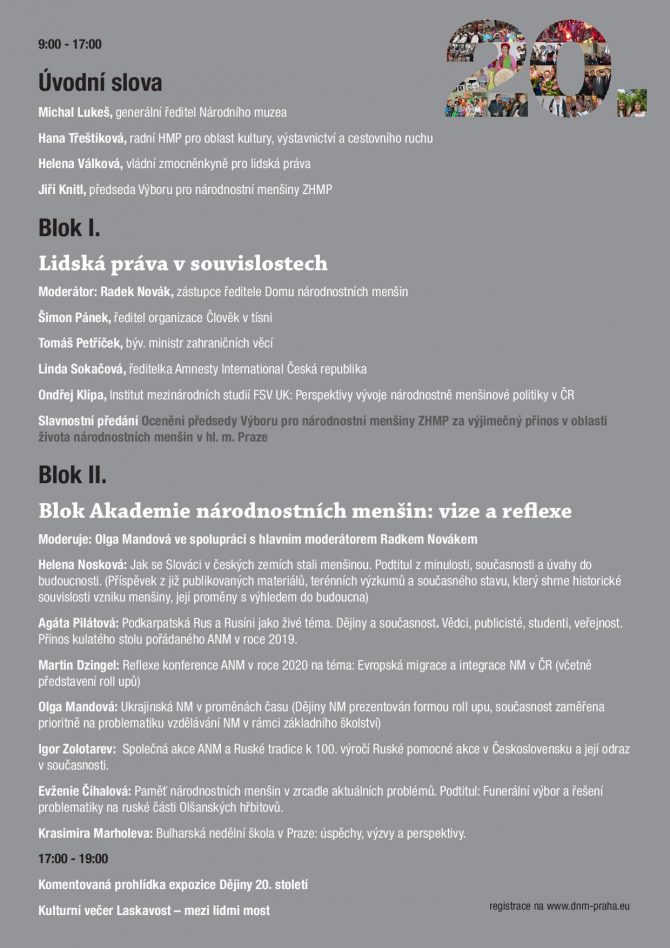 Zajímají vás aktivity pražských organizací národnostních menšin? Chcete se zapojit do odborné diskuse vztahující se k historii, současnosti, ale i budoucnosti týkající se národnostních menšin a tím i celé společnosti? Dům národnostních menšin o.p.s. ve spolupráci s Hlavním městem Praha a Národním muzeem Vás zvou na jubilejní 20. Setkání národnostních menšin, jehož program nabídne: