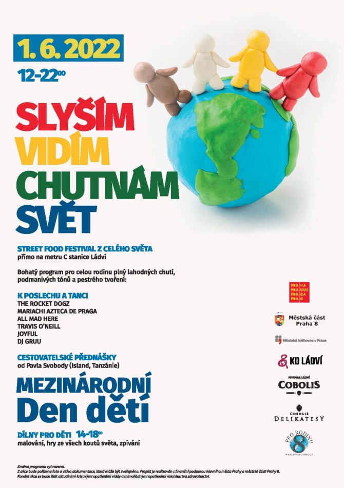 MČ Praha 8 a KD Ládví vás srdečně zvou na 2. ročník festivalu pro celou rodinu Slyším, Vidím, Chutnám svět. Procestujte zeměkouli za jeden den a okuste gastronomické speciality z různých světadílů, užijte si hudební produkci ze všech koutů zeměkoule a obohaťte své vědomosti na cestovatelských přednáškách o Islandu a Tanzánii. Na programu jsou v neposlední řadě oslavy Mezinárodního dne dětí. Připraveny budou tvůrčí dílny a hry z celého světa. Bude se kreslit, zpívat a všemožně tvořit. Čeká vás den plný lahodných chutí, podmanivých tónů a další zábavy pro celou rodinu. Kdy a kam dorazit? 1. 6. od 12 do 22 h na Ládví – přímo na stanici metra C. Dětský den se koná od 14 do 18 h.