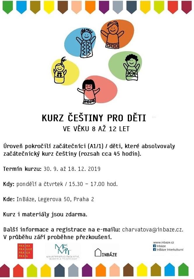 Na konci září začínají v nevládní neziskové organizaci InBáze, z.s. kurzy českého jazyka. Kurz češtiny pro děti ve věku 8 až 12 je určen pro pokročilé začátečníky (A1/1), tedy pro děti, které absolvovaly začátečnický kurz češtiny v rozsahu přibližně 45 hodin. Kurz potrvá od 30. září do 18. prosince 2019, výuka bude probíhat každé pondělí a čtvrtek od 15:30 do 17 hodin.