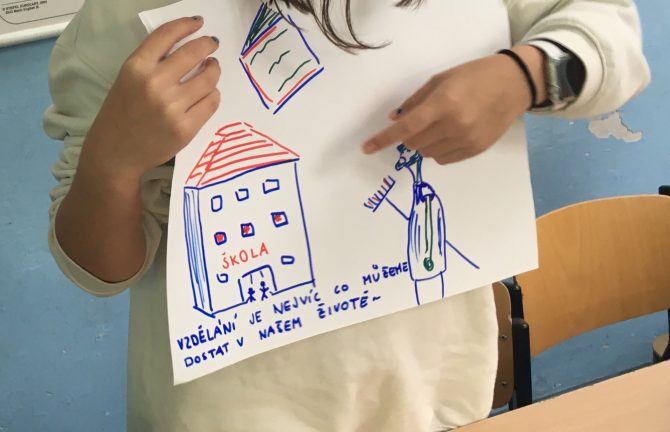 Dvanáct dětí ve věku 10 až 14 let pod vedením animátorky Kateřiny Knappové vytvořily 13minutový spot s názvem „Demokracie mýma očima“, který teď míří do českých škol. Jeho cílem je ukázat žákům na prvním a druhém stupni ZŠ, jak slovo demokracie vnímají jejich vrstevníci. Video je tak pro školní výuku rozděleno na dvě části (po cca sedmi minutách). Součástí prezentace na školách je také debata se samotnými tvůrci animovaného spotu. Ta má za cíl podnítit žáky k zamyšlení nad tím, co to znamená opustit rodnou zemi a přijet někam, kde se mluví jiným než jejich mateřským jazykem.