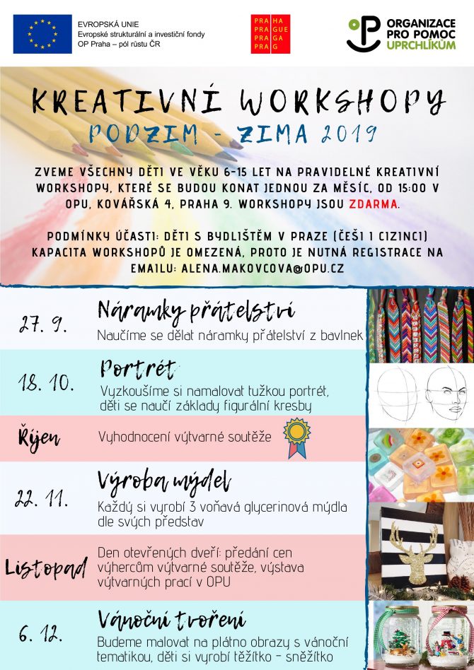Organizace pro pomoc uprchlíkům připravila i sérii kreativních workshopů pro děti Čechů i cizinců ve věku 6-15 let. Workshopy budou probíhat v pátek jednou měsíčně od 15 hodin v prostorách OPU na adrese Kovářská 4, Praha 9.
