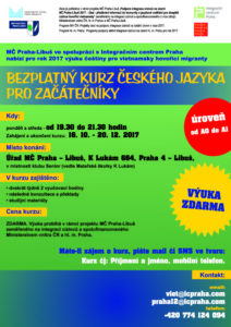 16. října otevře Integrační centrum Praha kurz českého jazyka pro začátečníky určený především pro vietnamské migranty. Kurz bude probíhat až do prosince 2017 a to každé pondělí a úterý od 19:30 do 21:00 v prostorách klubu Senior v městské části Praha – Libuš. Pokud se chcete na tento kurz zaregistrovat, kontaktujte prosím Branislava Makúcha na 775 791 202, nebo na emailové adrese praha12@icpraha.com.