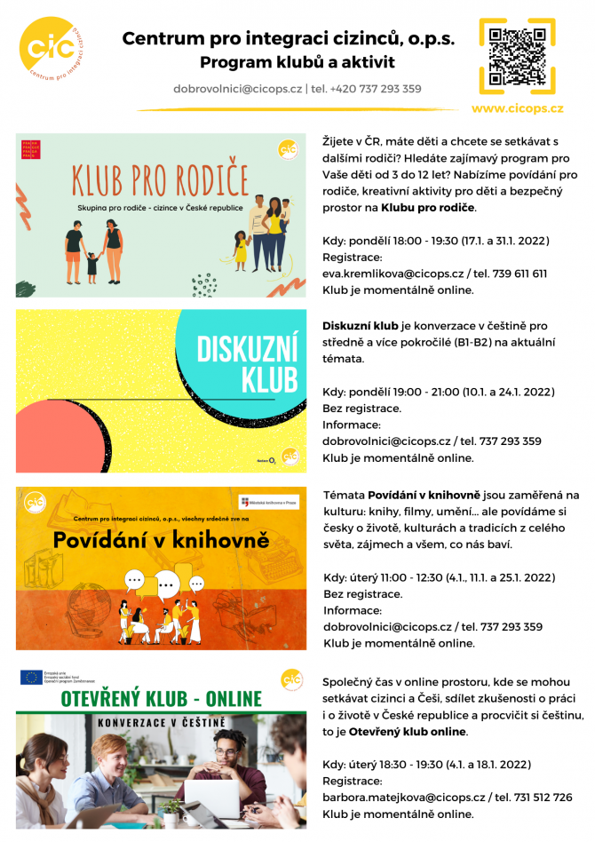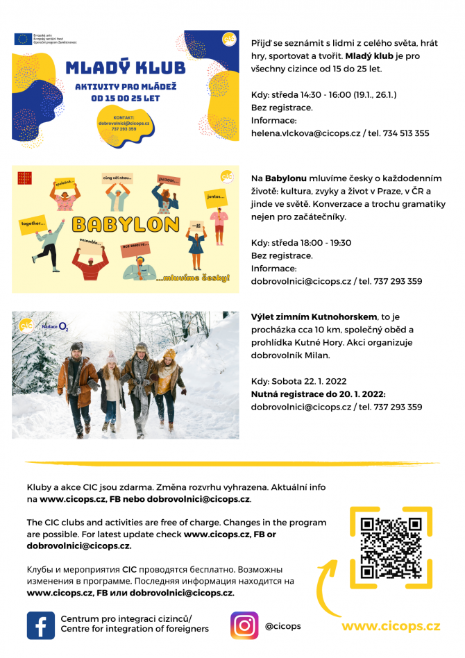 Prohlédněte si pravidelný program aktivit dobrovolnického programu, který probíhá i v lednu a nabízí zdarma konverzační kluby, aktivity pro děti a mládež či výlety. Všechny kluby a akce najdete na webu CIC.