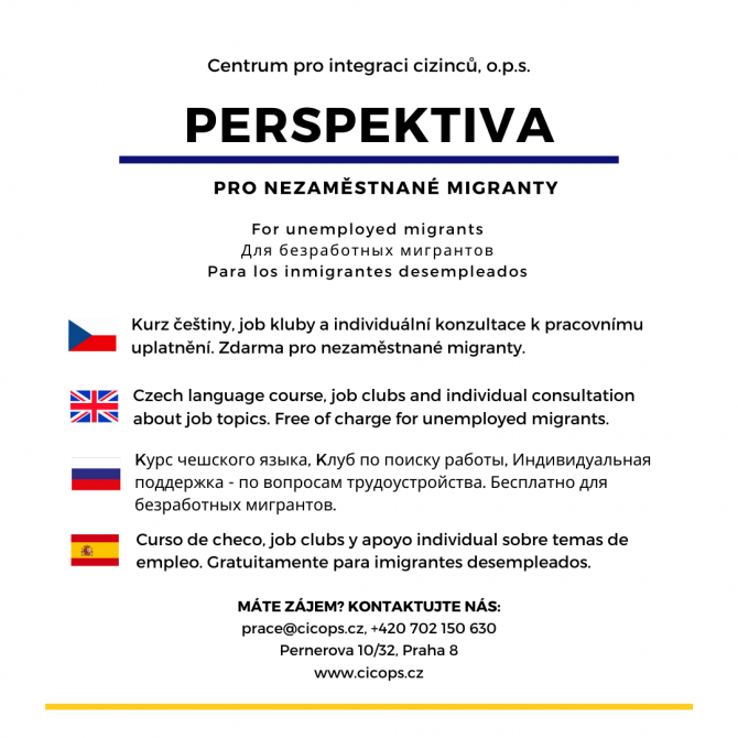Zároveň začíná nový semestr služby PERSPEKTIVA pro nezaměstnané migranty. V rámci služby nabízí CIC kurz češtiny pro klienty zdarma. Kurz začíná 17. ledna a je možné se přihlásit na dvě různé úrovně. Ještě stále jsou volná místa. Další informace naleznete na webu CIC.