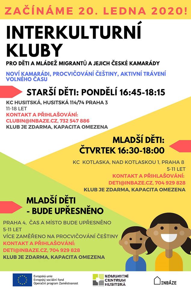 InBáze, z.s., otevírá nové interkulturní kluby pro děti a mládež. Kluby jsou určeny dětem a mládeži migrantského původu a jejich českým kamarádům. V rámci těchto klubů mají děti možnost aktivně trávit volný čas, poznat nové kamarády a procvičovat češtinu v neformálním prostředí. Vítán je každý bez ohledu na národnost, náboženské vyznání či barvu pleti. Komunikačním jazykem je čeština, ale její dokonalá znalost není podmínkou. Kluby jsou zdarma.