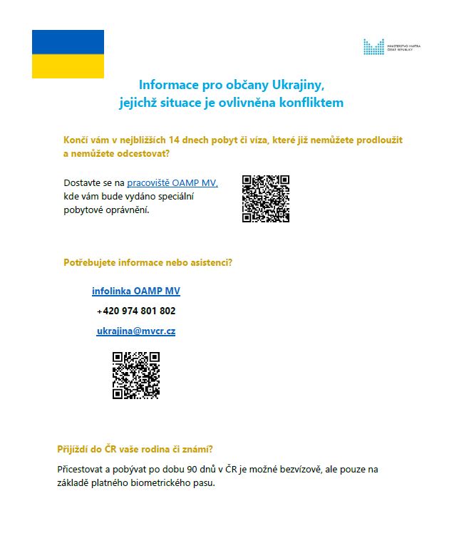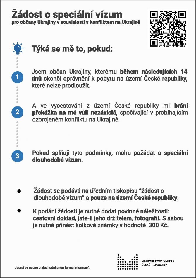 Pro občany Ukrajiny, kterým během následujících 14 dnů skončí oprávnění k pobytu na území České republiky, které nelze prodloužit, pripravilo Ministerstvo vnitra speciální úřední hodiny na pracovištích OAMP MV. Mohou si požádat o speciální vízum (viz níže). Speciální úřední hodiny jsou vždy v pátek od 8:00 do 14:00.