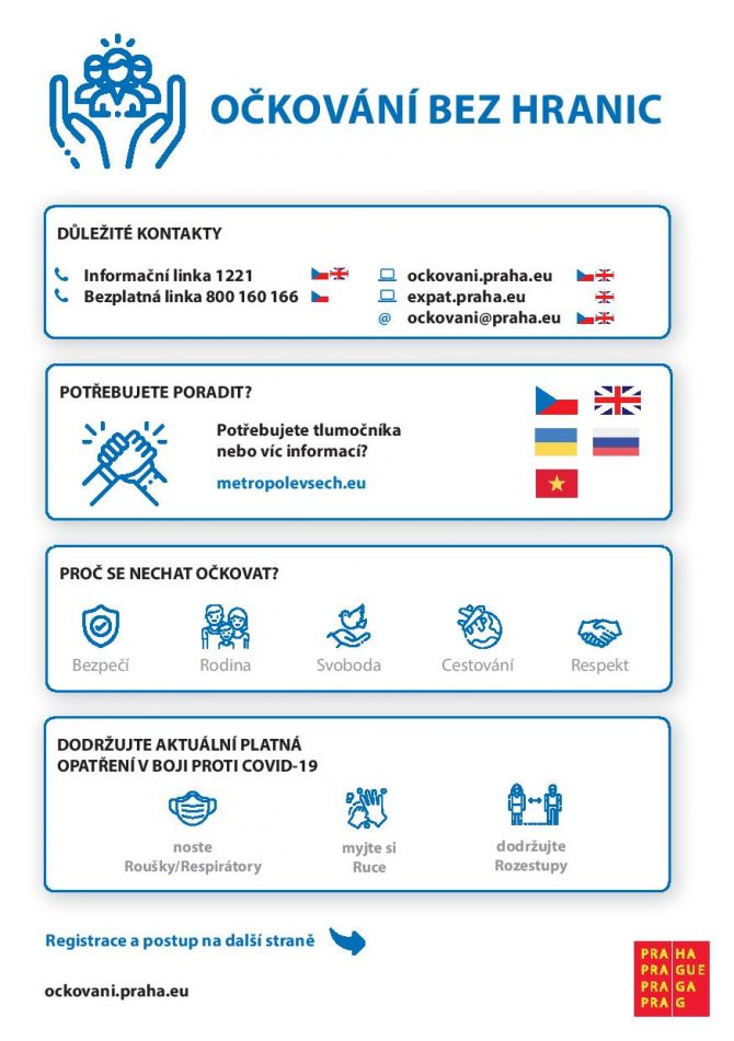 Pro více informací navštivte webovou stránku magistrátu hlavního města Prahy, která obsahuje všechny potřebné informace k očkování proti covid-19 v Praze, včetně aktualit, nejčastějších otázek a odpovědí, ale i praktické rady jak postupovat při registraci a další. Stránka je prozatím v českém jazyce, plánuje se i její anglická verze.
