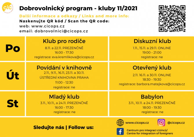 Centrum pro integraci cizinců vám v listopadu přináší opravdu pestrý program. Rádi bychom vás pozvali do Klubu pro rodiče, kde nově zároveň probíhá i dětský klub s integrační pracovnicí. Během listopadu též CIC organizuje seminář pro cizinky na téma Porod, těhotenství a šestinedělí v ČR. Podívejte se na nabídku pravidelných i aktuálních akcí, každý si určitě něco vybere!
