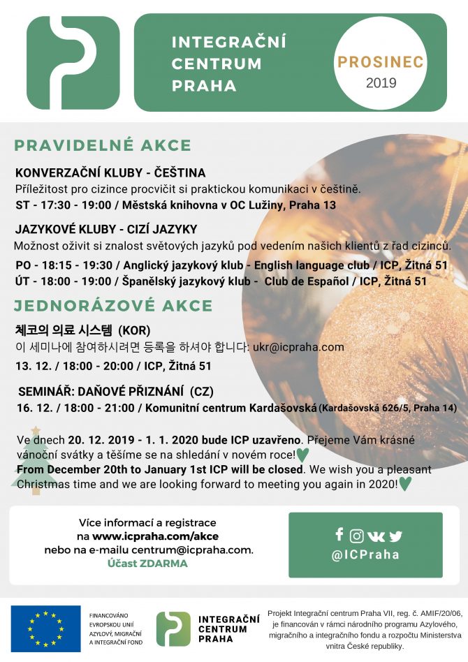 Ani v prosinci si nenechte ujít středeční konverzační klub zaměřený na procvičení češtiny. Dále můžete konverzovat v angličtině a ve španělštině. 16. prosince navštivte v Integračním centru seminář na téma daňová přiznání. Seminář bude probíhat v českém jazyce. Od 20. prosince až do konce roku bude ICP uzavřeno a přivítá vás opět v novém roce.
