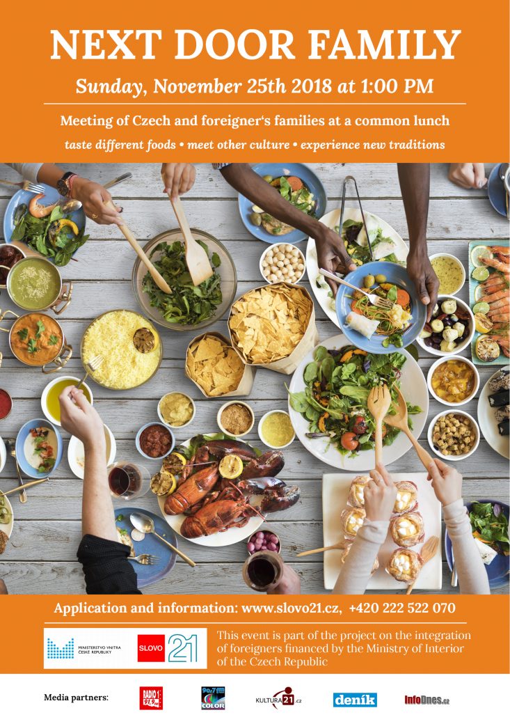 The Next Door Family is a successful project in which more than 1,550 Czech and foreign families have taken part so far. It is very popular abroad, too. Since 2012, similar meetings have been taking place in Portugal, Spain, Italy, Malta, Slovakia, Hungary, Belgium, and the Cape Verde Islands. The idea of having someone for lunch has proved an interesting and effective instrument for the integration of foreigners in the society.
