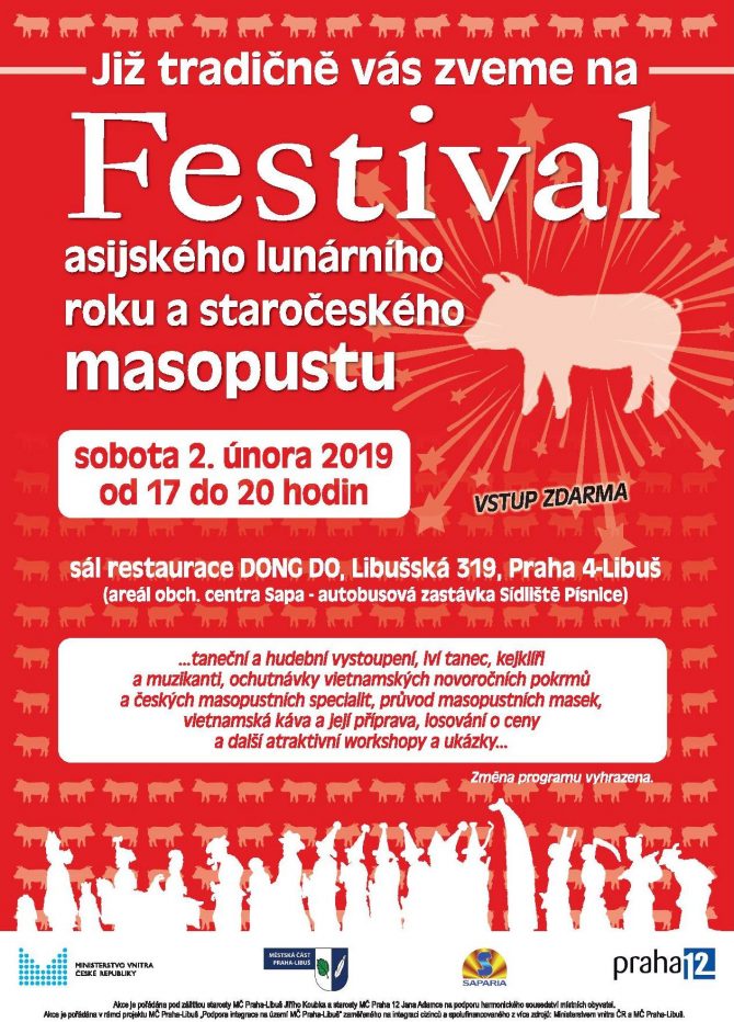 The Prague-Libuš City District would like to warmly invite you to the 6th year of the New Lunar Year and Old-Bohemian Carnival Festival, which will take place on 2nd February 2019 at the Dong Do restaurant hall in the SAPA shopping centre. The celebrations will start at 5 p.m. and there will be a full programme for visitors until 8 p.m. You can look forward to traditional Czech carnival delicacies as well as Vietnamese New Year snacks. There will be dance music, various performances of children and adults, a draw for great prizes, and interesting workshops.
