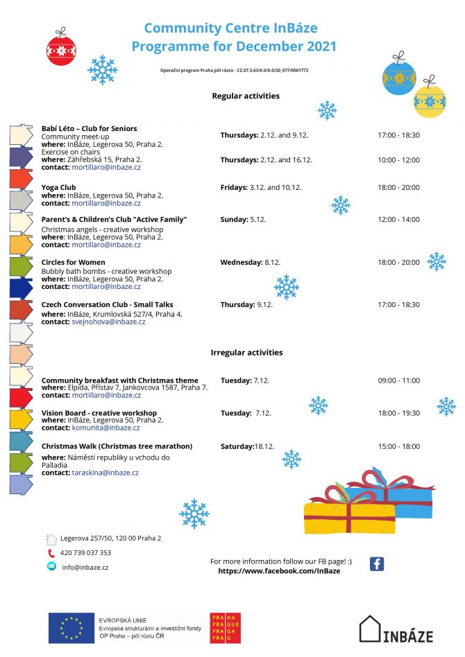 The December programme of the InBaze community centre is here. As usual, you may look forward to regular clubs such as the yoga club, the parents and children’s club called Aktivní rodinka, or the Babí léto senior club. You can also take part in interesting Christmas-themed events. Make sure not to miss the Christmas breakfast planned on 7th December and the walk aptly called Christmas Tree Marathon on 18th December.