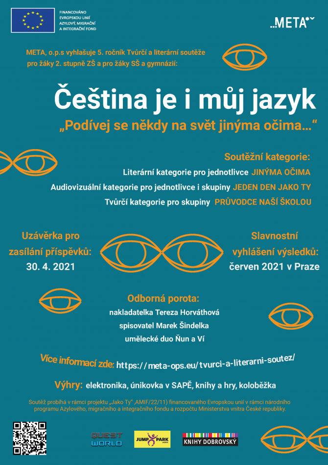 The Meta NGO has launched the 5th year of the language and literary competition Čeština je i můj jazyk (Czech is my language as well). For the fifth time, primary and secondary school students can give some thought to what it means to be a foreigner and not to understand people around them. The competition encourages literary creation and brings an opportunity for students whose mother tongue is Czech and speakers of different mother tongues to become acquainted with each other. This year’s competition motto is: ‘Try to look at the world through different eyes. You will see that not everyone sees it the way you do.’