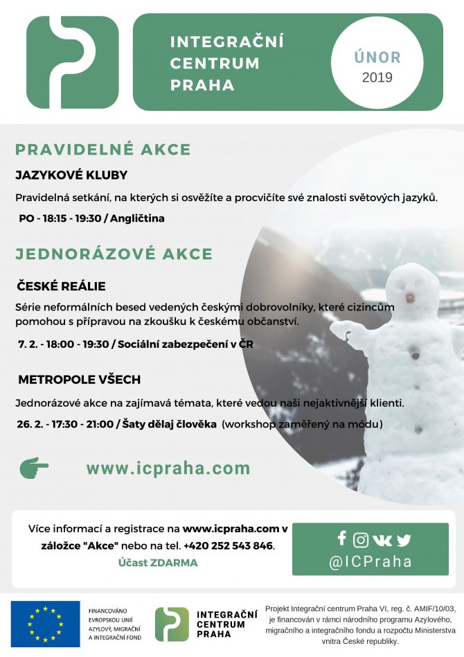 Monday evenings have been dedicated to meetings where you can brush up your English. Make sure not to miss them in February! You can also come to another lecture from the series for foreigners preparing for the Czech citizenship. This time, the topic is social security. At the end of the month you can look forward to a fashion workshop called Šaty dělaj člověka (The Tailor Makes the Man).