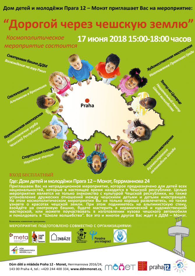 Дом детей и молодёжи Прага 12 – Монэт приглашает Вас на мероприятие: “Дорогой через чешскую землю”. Космополитическое мероприятие состоится 17 июня 2018 15:00-18:00 часов.