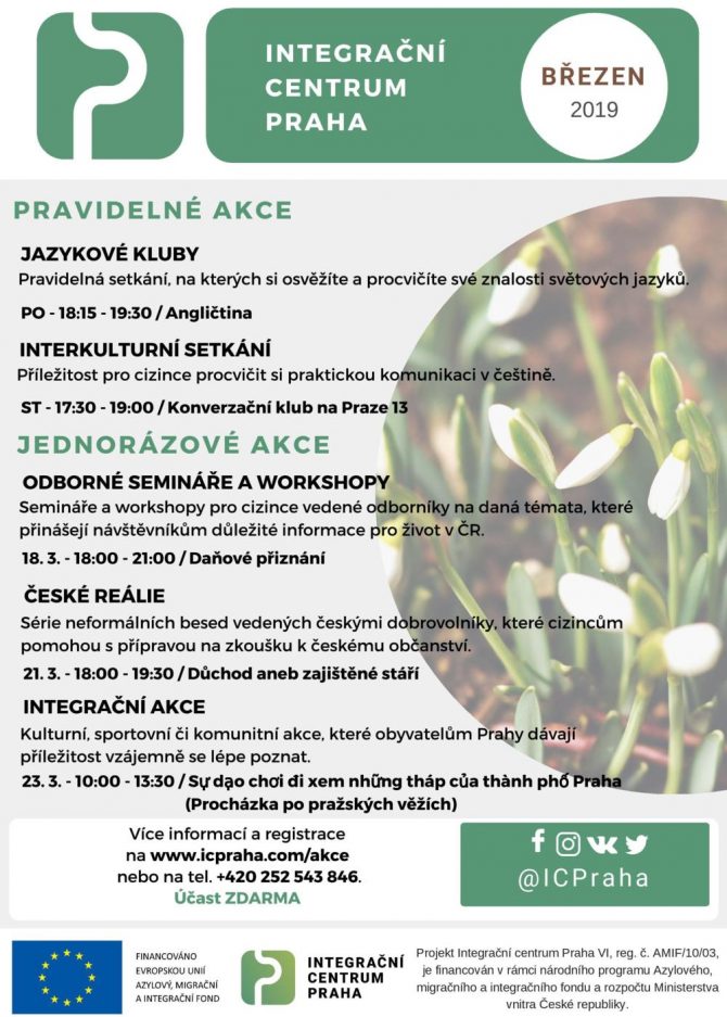 И в марте вы сможете вечером по понедельникам тренировать свой английский, а по средам – чешский. Во второй половине месяца не пропустите семинар на тему «Налоговая декларация» или дискуссию о пенсиях. А в субботу 23 марта отправляйтесь с ИЦП на прогулку по пражским башням.