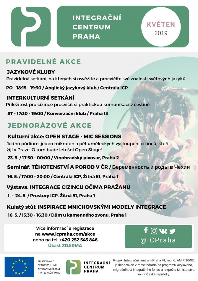 Май в Интеграционном центре Прага будет полон событий. Вы можете снова посещать регулярные языковые курсы и принять участие в разнообразных культурных и обучающих мероприятиях. В понедельник проходят занятия по английскому, а в среду вы можете улучшить свой разговорный чешский. Не пропустите выступление пяти иностранцев, живущих в Праге, 23 мая в рамках «Open stage». В центре ICP на улице Žitná вы сможете до 24 мая посетить выставку, посвященную интеграции иностранцев с точки зрения пражан. 16 мая пройдет семинар на тему «Беременность и роды в Чехии» и в этот же день ICP устраивает круглый стол на тему «Вдохновение мюнхенскими моделями интеграции».