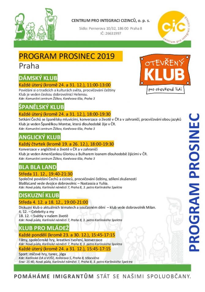 Центр интеграции иностранцев (CIC) предлагает каждый месяц регулярные и нерегулярные мероприятия, которые подойдут каждому из вас! Во вторник мы приглашаем вас в Женский и Испанский клуб, в среду вы можете поболтать на чешском на разные темы на традиционном Бла-Бла Ленде или в Дискуссионном клубе, а в четверг – потренировать свой английский. Подготовьтесь к Рождеству вместе с CIC! Уже в четверг 5.12. вас ждет творческая мастерская, 7.12. – познавательная поездка о традициях в преддверии Рождества и чешской истории в Коуржим, а 12.12. – приготовление чешского рождественского печенья.