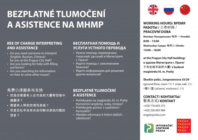 Чиновники Магістрату та його клієнти-іноземці можуть цього року користуватися безкоштовними послугами з усного перекладу з англійської, російської та китайської мов на чеську. Безпосередньо в будівлі Магістрату, що знаходиться у Палаці Шкоди (Škodův palác), працює міжкультурний працівник Інтеграційного центру Прага, який допомагає подолати мовний та соціально-культурний бар’єр у спілкуванні іноземців та чиновників.Міжкультурний працівник не тільки полегшує роботу державних службовців, але й допомагає іноземцям легше вирішити їх справи в міському управлінні.