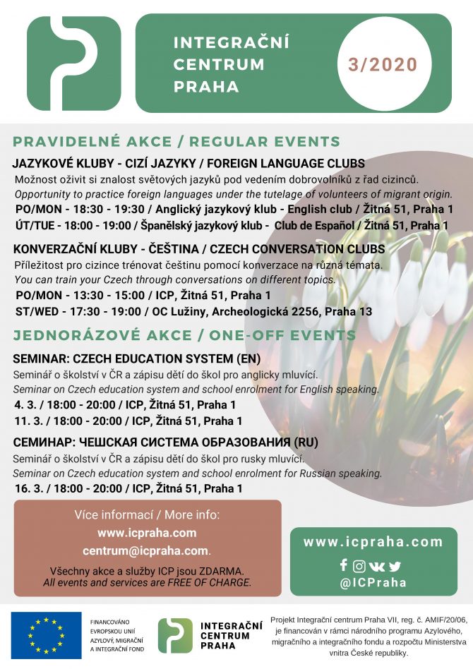 Cũng trong tháng 3, quý vị có thể chào đón các câu lạc bộ tiếng Anh và tiếng Tây Ban Nha thông thường và một câu lạc bộ trò chuyện nơi quý vị có thể thực hành tiếng Séc. Buổi thuyết giảng về giáo dục tại Cộng hòa Séc và tuyển sinh cho trẻ em vào các trường cho người nói tiếng Anh sẽ được tổ chức vào hai ngày, cụ thể là ngày 4 và 11 tháng 3, do rất nhiều phụ huynh quan tâm. Buổi thuyết giảng cùng với tiêu trí và chủ đề cho những người nói tiếng Nga sẽ được diễn ra vào ngày 16 tháng 3. Tất cả các sự kiện và dịch vụ ICP đều miễn phí.
